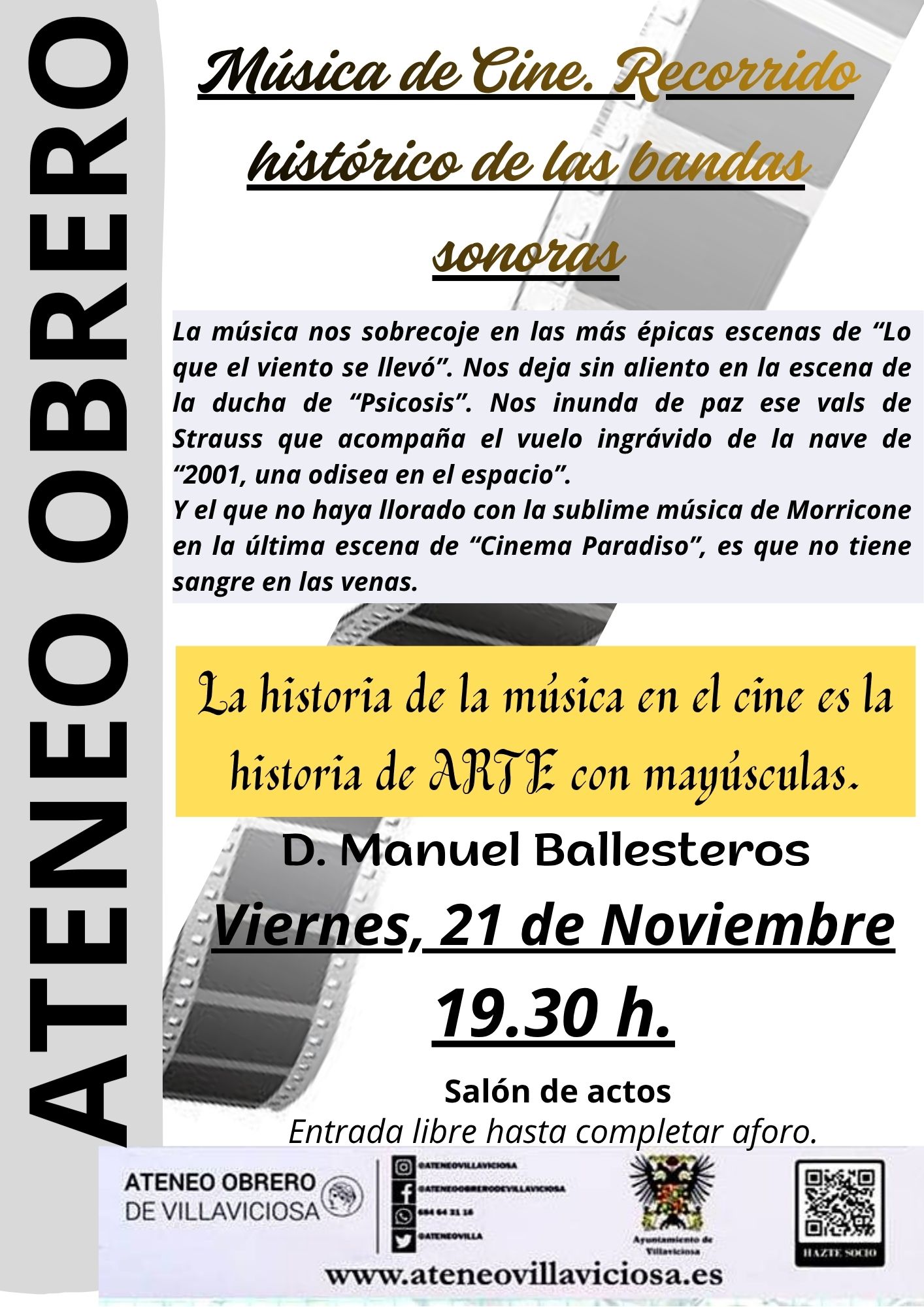 Viernes 21 de Noviembre a las 19:30 h, en el Salón de Actos del Ateneo, Manuel Ballesteros  profesor en los Conservatorios Superior de Música de Asturias y Profesional de Oviedo, presentó Música de Cine. Recorrido histórico de las bandas sonoras.